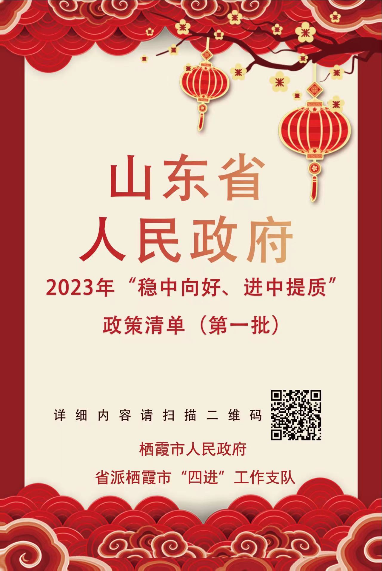根據(jù)省委經(jīng)濟工作會議部署,聚焦聚力穩(wěn)住經(jīng)濟基本盤、促進高質(zhì)量發(fā)展,持續(xù)鞏固“穩(wěn)中向好、進中提質(zhì)”良好態(tài)勢,進一步強化跨周期調(diào)節(jié)和政策統(tǒng)籌銜接,2022年12月30日,省政府印發(fā)了《2023年“穩(wěn)中向好、進中提質(zhì)”政策清單(第一批)》。為幫助企業(yè)精準享受政策紅利,棲霞市人民政府聯(lián)合省派棲霞“四進”工作支隊將政策清單制作了宣傳海報,企業(yè)只需通過識別圖片二維碼,即可查閱瀏覽政策清單內(nèi)容及相關解讀。