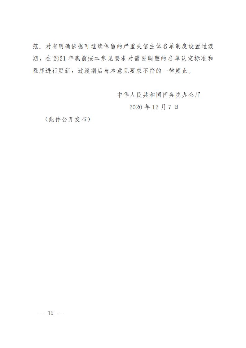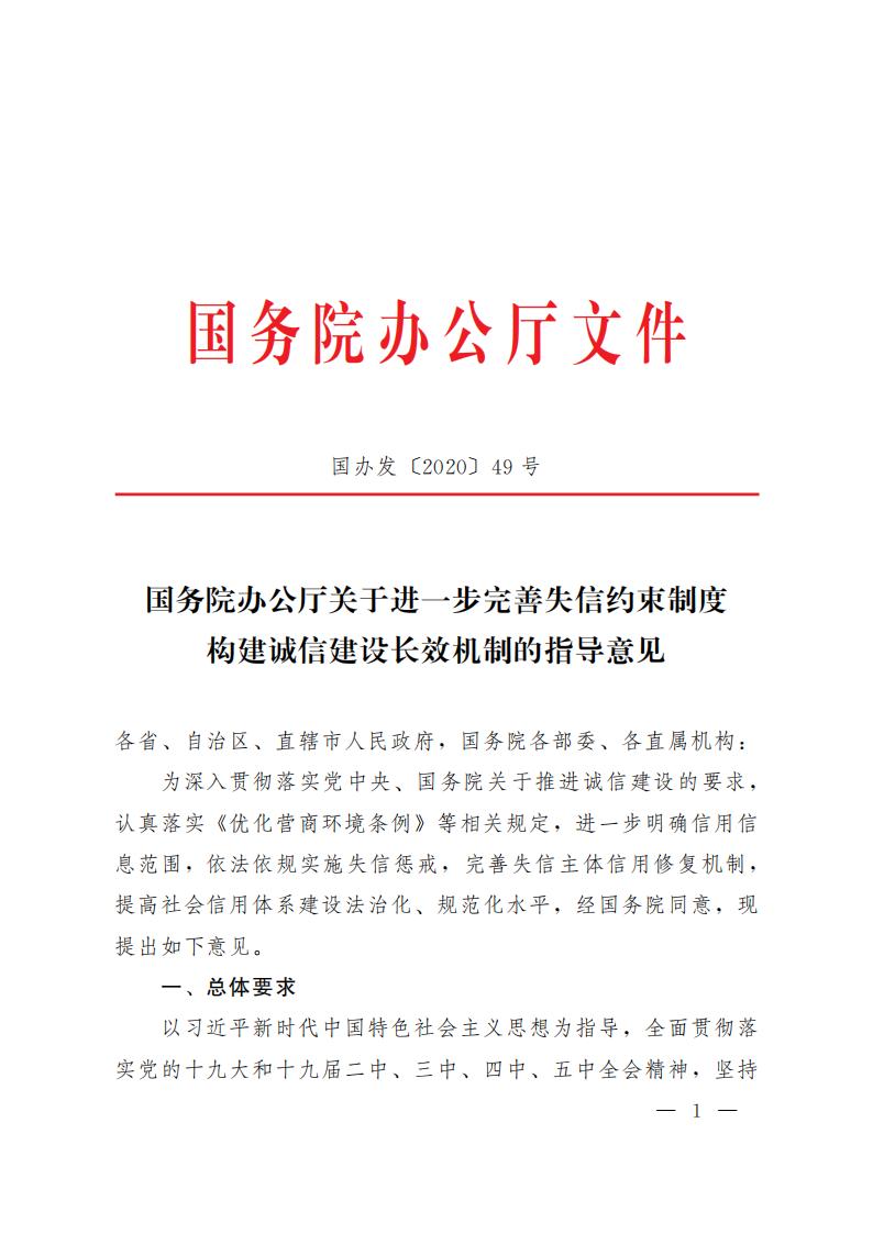 國務院辦公廳《關于進一步完善失信約束制度構建誠信建設長效機制的指導意見》(國辦發〔2020〕49號)