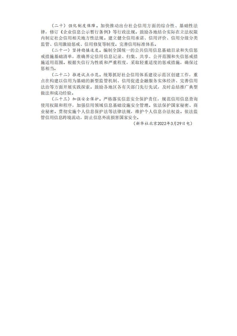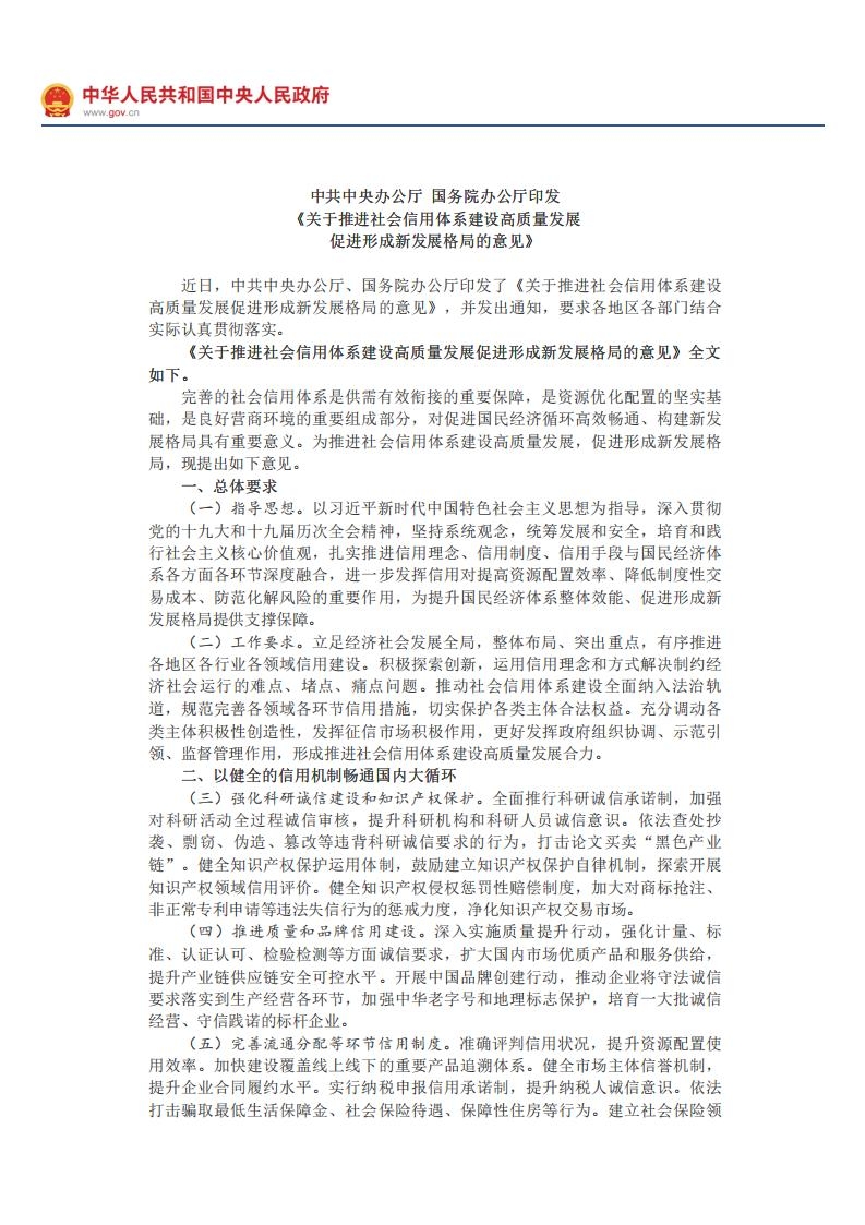 中共中央辦公廳 國務院辦公廳印發《關于推進社會信用體系建設高質量發展促進形成新發展格局的意見》