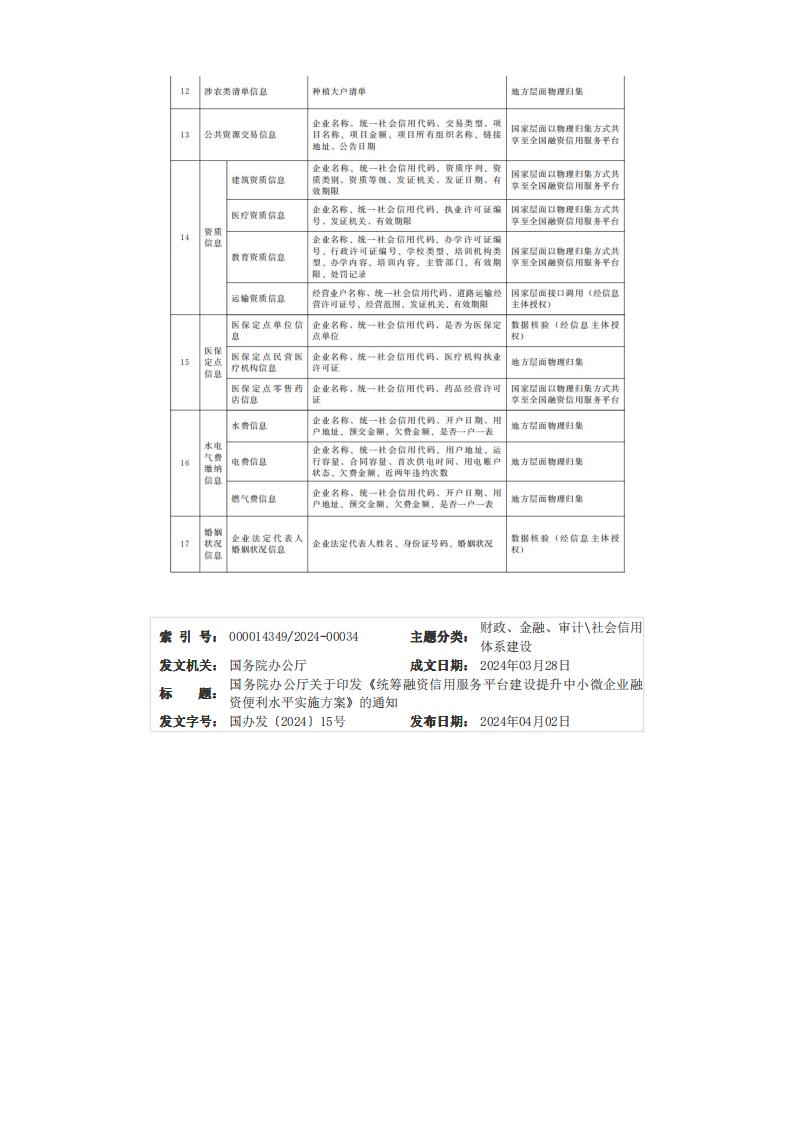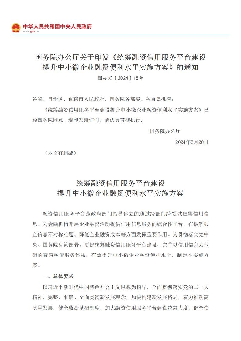 國務院辦公廳關于印發《統籌融資信用服務平臺建設提升中小微企業融資便利水平實施方案》的通知(國辦發〔2024〕15號)