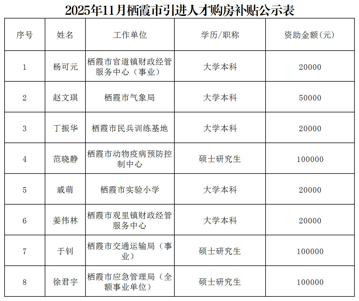 根據《煙臺市引進人才生活補貼和購房補貼發放實施細則(試行)》文件要求,對符合條件的新引進人才發放生活補貼和購房補貼,經單位申報,我市有106人符合人才引進補貼發放標準?,F進行公示,公示期為5個工作日。公示期間如有異議,請向棲霞市公共就業和人才服務中心反映。