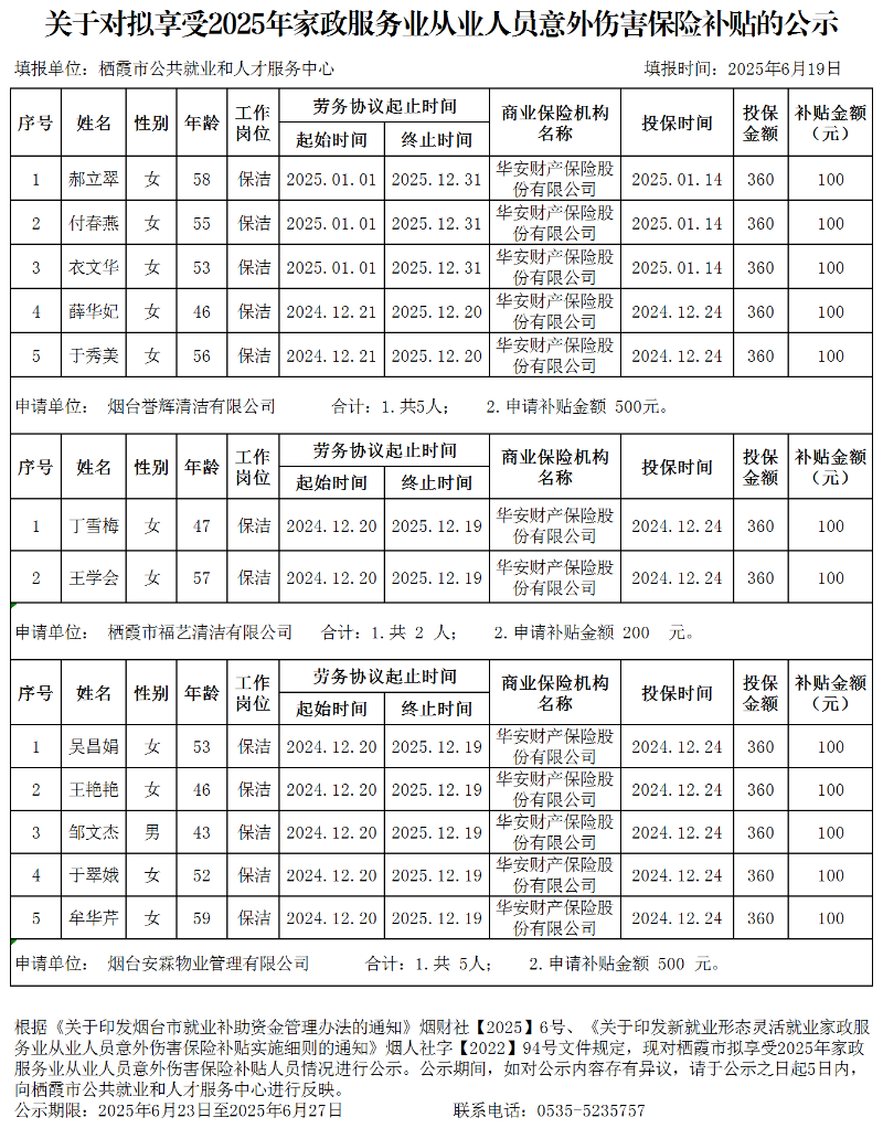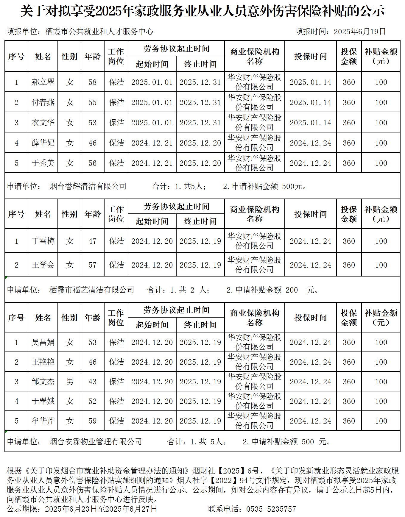 關于對擬享受2025年家政服務業從業人員意外傷害保險補貼的公示