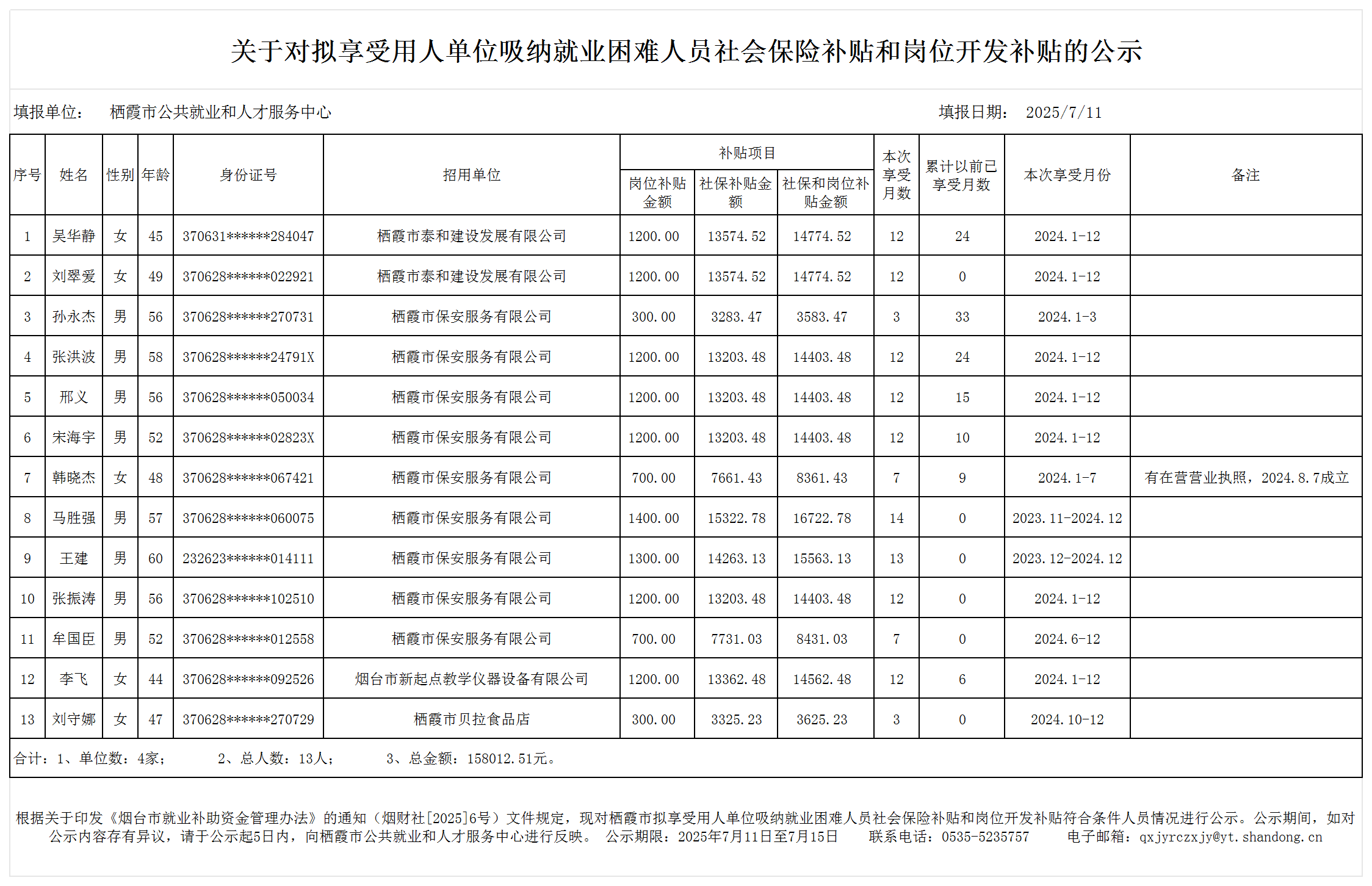 關于對擬享受用人單位招用就業困難人員社保和崗位補貼的公示